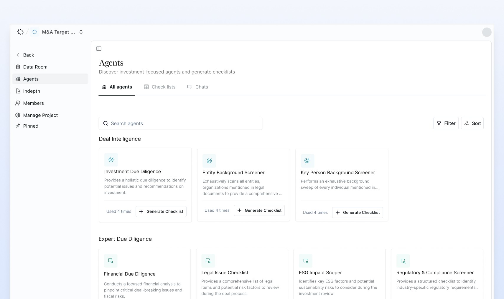 Agents can work together within the same project environment, combining insights and cross-referencing evidence to generate more comprehensive findings.Scalable Diligence Workflows: